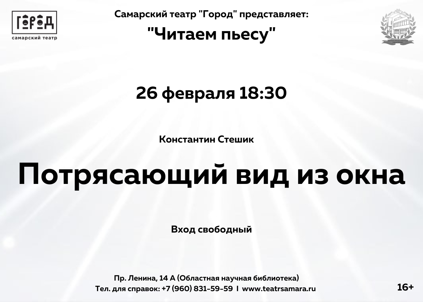 Место: пр. Ленина, 14 А (Областная научная библиотека. Вход в библиотеку и театр со стороны пр. Ленина)