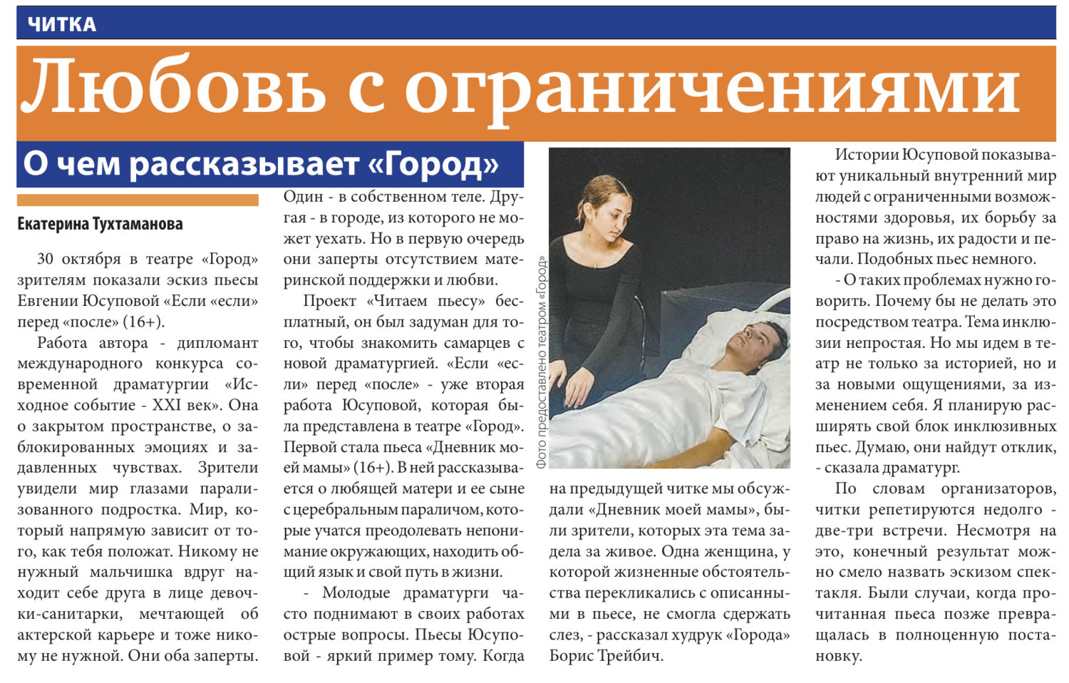 Проект "Читаем пьесу" беспланый, он был задуман для того, чтобы знакомить самарцев с новой драматургией. "Ести "если" перед "после" - уже вторая работа Юсуповой, которая была представлена в театре «Город». Первой стала пьеса "Дневник моей мамы" (16+). В ней рассказывается о любящей матери и её сыне с церебральным параличом, которые учатся преодолевать непонимание окружающих, находить общий язык и свой путь в жизни.